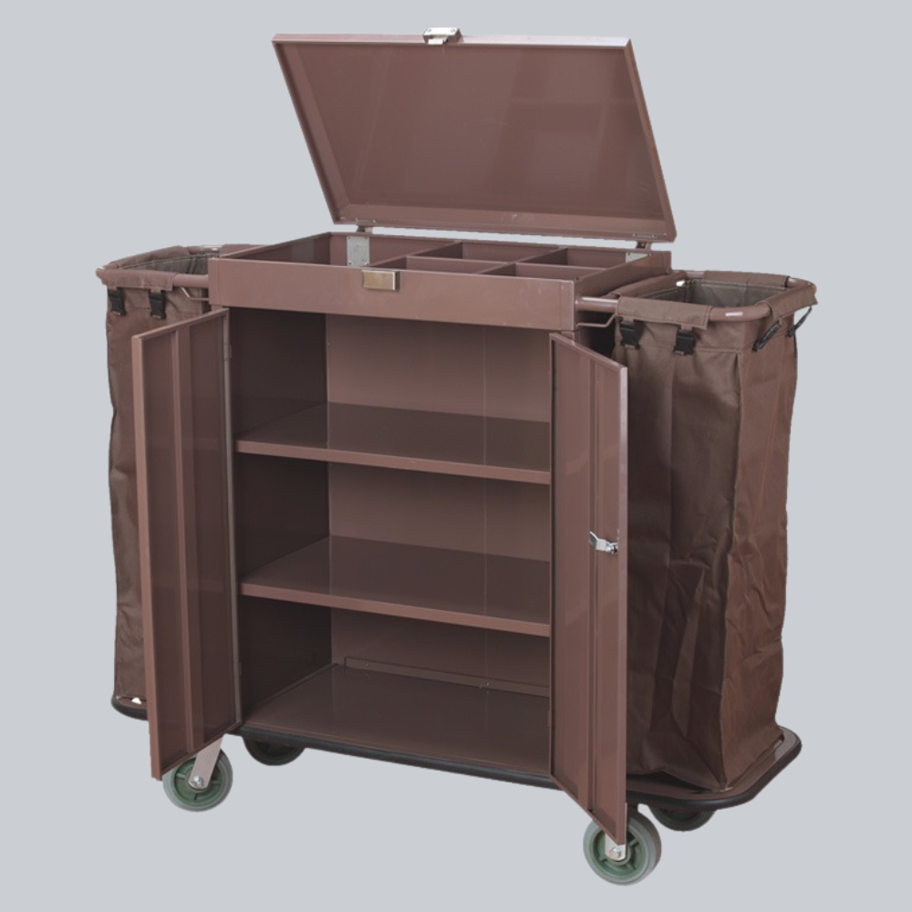 This Brown Housekeeping Trolley for Hotels is a practical and durable solution for efficiently managing housekeeping tasks. Designed with multiple spacious compartments, it allows staff to easily store and transport cleaning supplies, linens, and amenities. The trolley features sturdy wheels for easy maneuverability, even in tight spaces, ensuring quick and smooth service throughout the hotel. Its elegant brown finish adds a professional touch, while the robust construction ensures long-lasting performance. Ideal for busy hotel environments, this trolley helps maintain organization and streamline housekeeping operations with ease.
